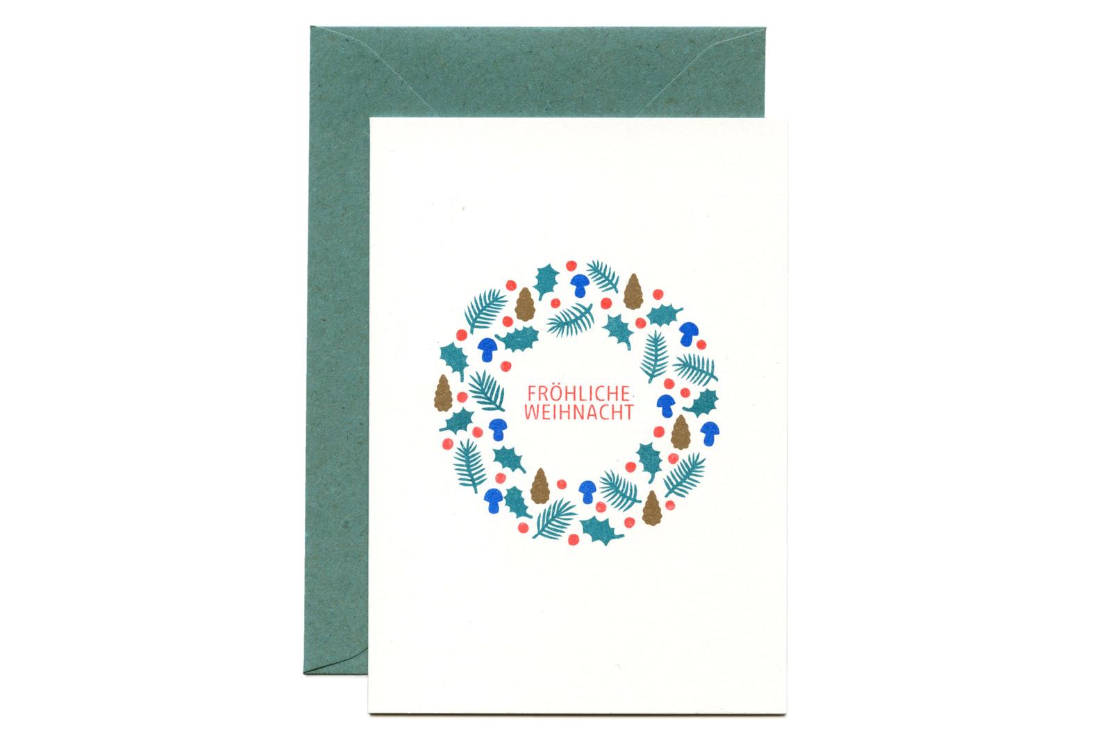This pretty Christmas card says "Merry Christmas" in German. It is designed and printed on a risograph in Berlin.