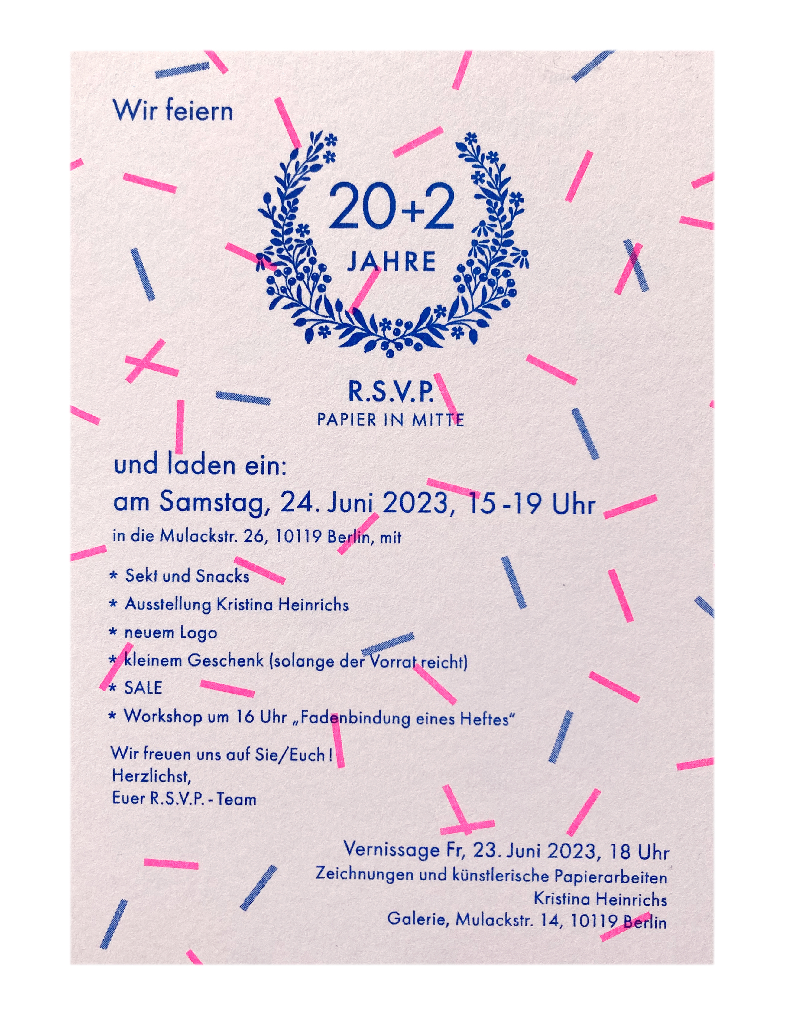 Papeterie R.S.V.P. || Mulackstr. 14 + 26 || 10119 Berlin || 030.31956410 || Mo-Sa 11 - 19 Uhr