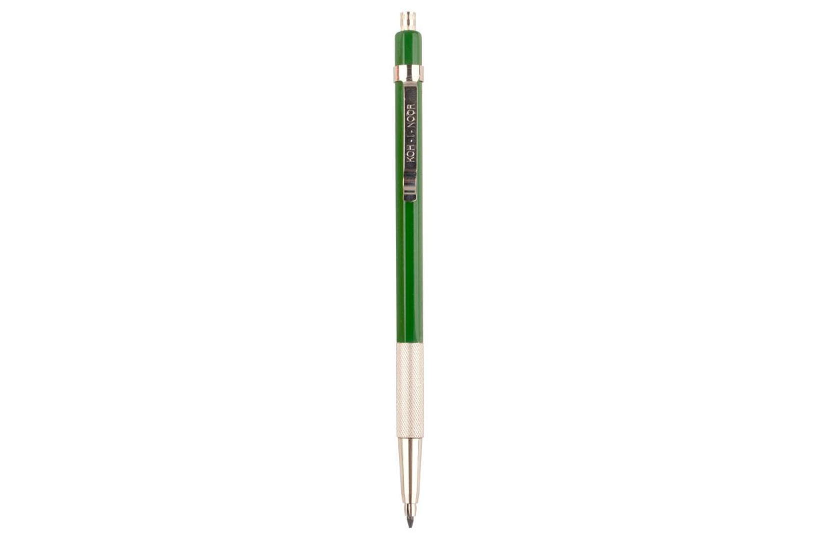 Der Fallbleistift 5221 mit fein geriffelter Griffzone des tschechischen Traditionsherstellers Koh-I-Noor gibt es in drei farblichen Ausführungen. Mit dem herausgeschraubten Druckknopf lassen sich die 2mm Minen anspitzen.